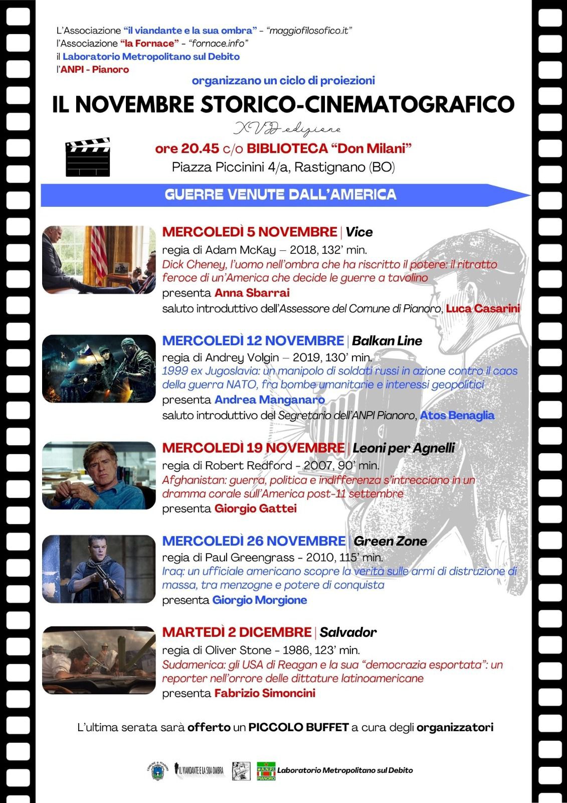 La rassegna dei film di questa edizione del "Novembre storico-cinematografico" è dedicata alle guerre provocate dall'impero americano sul volgere del nuovo secolo. Nella seconda metà del '900 la vecchia potenza era ancora in grado di controllare saldamente il "cortile di casa", come viene raccontato da Oliver Stone in SALVADOR, l'ultimo dei film della rassegna che sarà proiettato martedì 2 dicembre.